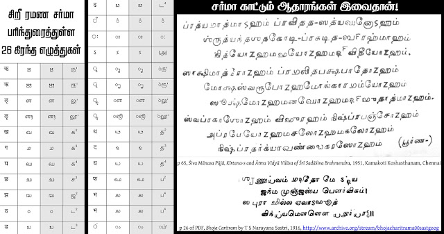 அதற்கு அவர் காட்டியிருக்கும் எடுத்துக்காட்டுகள்: 1951ஆம் ஆண்டு சென்னை, காமகோடி கோஷஸ்தனம் வெளியிட்டுள்ள ஸ்ரீசதாஸிவ பிரமேந்திராவின் ஸிவ மானச பூஜா கீர்த்தனாஸ் மற்றும் ஆத்ம வித்யா விலாச என்னும் நூலும், 1916ஆம் ஆண்டு வெளியான டி.எஸ். நாராயண சாஸ்திரி என்பாரின் போஜ சரிதம் என்னும் நூலுமாகும்.இவைதான் இன்னும் புழக்கத்தில் இருக்கின்றனவாம். இதை தமிழ் ஒதுக்கீட்டில் இணைத்து விரிவாக்கப்பட்ட தமிழ் (Extented Tamil) என்ற பெயரில் அங்கீகரிக்க வேண்டுமாம். அப்படி இவ்வெழுத்துகள் தமிழ் என்ற பெயரில் இணைக்கப்பட்டால், அது விரிவாக்கப்பட்ட தமிழாக இருக்காது. படுகொலை செய்யப்பட்ட தமிழாகத் தான் (Assassinated Tamil) இருக்க முடியும்.